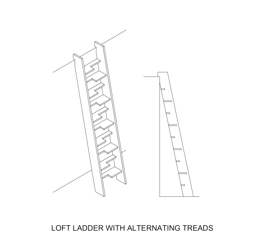 Ladders are ideal stairs for small spaces. These drawings give you an idea of some of the ladders we have built often. Custom-designed ladders are available to fit any need and space. To get a quote, please tell us the width and the overall height you need. Do you want one of the designs shown here, or do you have a concept image you want us to design from?