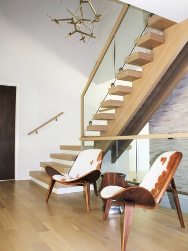 Open Riser Staircases provide beautiful solutions to allow the free movement of light within their interior design. The absence of risers allows for the use of heavy treads and a variety of beam-like stair stringers that allow this modern staircase design to be referred to as "Floating Stairs". Frequently used in combination with glass and large, open areas, an open-riser stair brings a blend of contemporary art and functionality to a commercial building or home décor. The open-riser staircase is one of the most popular and functional types of open stairs in modern home design.