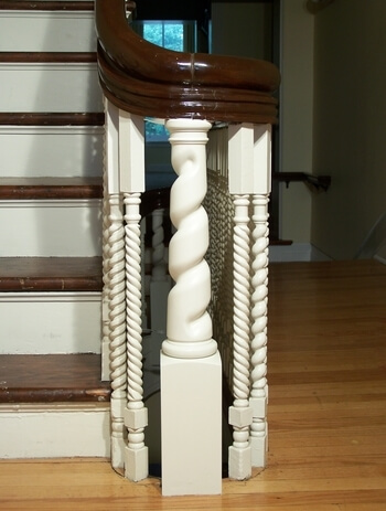 The Wilder Mansion in Elmhurst, Illinois was built in 1868 and featured a "continuous rail" design without the use of newels. Over the years the rail became unstable. Due to the high traffic within the mansion, the loose railing was a concern. After having several other stair companies try and fail at their attempts to strengthen the railing system, Designed Stairs, Inc. was called. Designed Stairs, Inc. designed newels for the system and placed them where existing balusters could be removed. Once the structural newels were installed and several joints in the rail were repaired, the entire balustrade was finally solid.